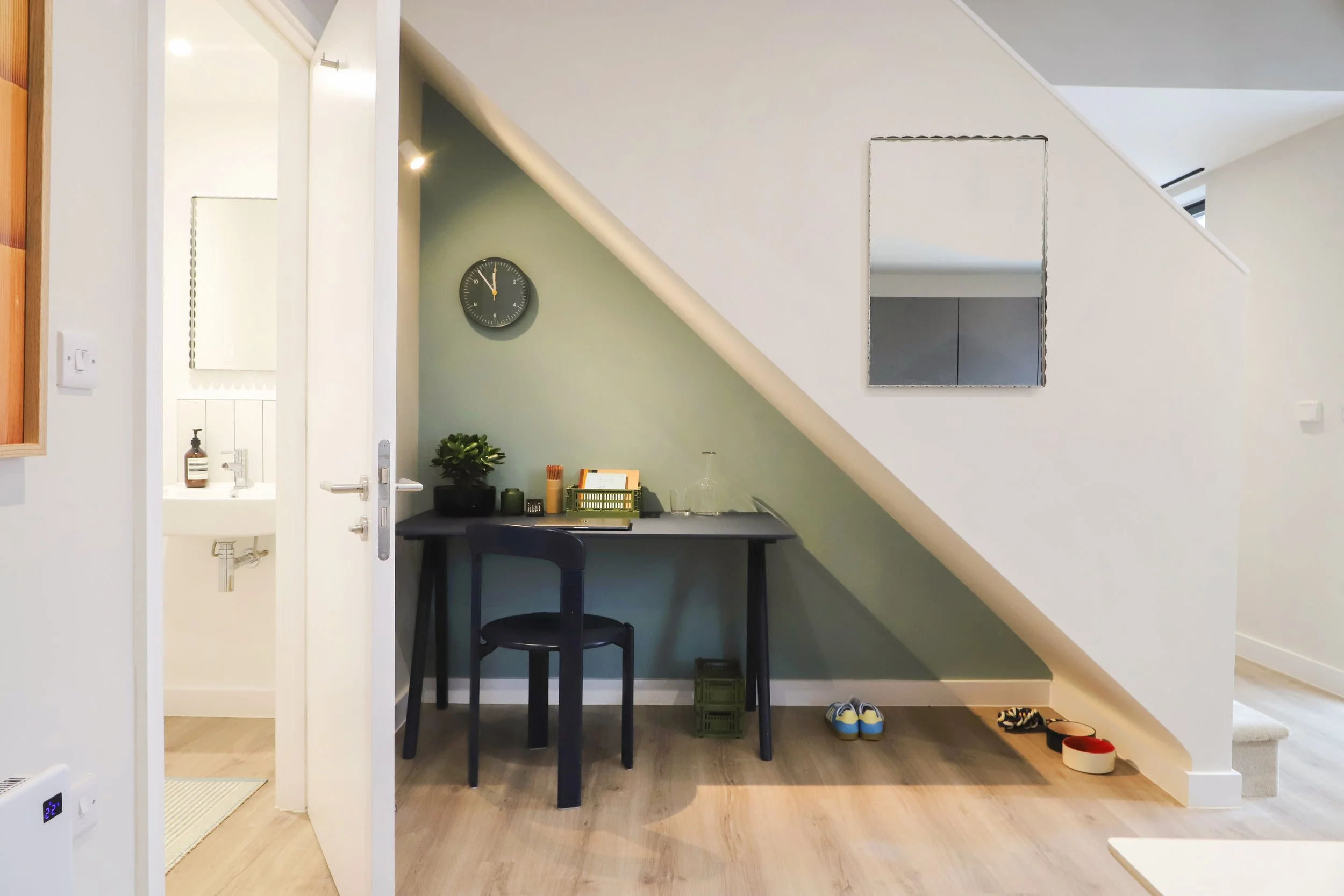 even the smallest spaces were not overlooked. what might have been a forgotten corner in the open-plan kitchen-diner has been transformed into a discreet, efficient work-from-home nook, demonstrating the project's thoughtful attention to how people really live.